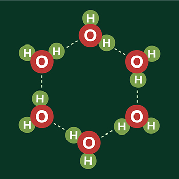 This hexagonal pattern comes from the structure of water molecules. Each water molecule is composed of H2O, i.e., two hydrogen atoms attached to one oxygen atom. In ice, the oxygen atoms also form hydrogen bonds with neighboring water molecules. When frozen, these water molecules arrange into a hexagonal lattice.