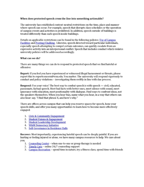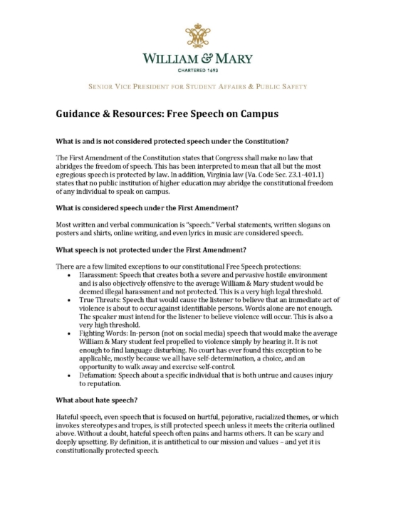 Each year questions arise about free speech on campus. The attached PDF addresses frequently asked questions and provides links to additional guidance and campus resources.